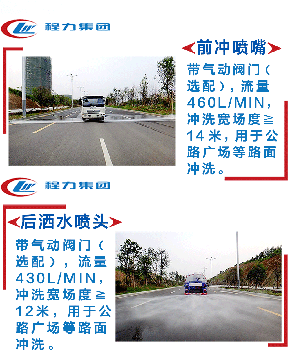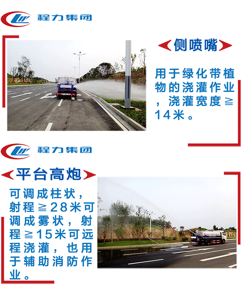 | 其他 | 1、選裝不帶灑水平臺及選裝帶噴霧機組。 2、運輸介質:水,密度:1000千克/立方米,整車尺寸(長×寬×高)/前懸/后懸/罐體外形尺寸(長×長軸×短軸)/整備質量對應關系: a、帶灑水平臺時,罐體有效容積:14.93立方米,10100×2500×2950/1450/3000/6600×2300×1450/10580 b、不帶灑水平臺時,罐體有效容積:14.93立方米,10100×2500×2950/1450/3000/7200×2100×1450/10580 c、帶噴霧機組時,罐體有效容積:12.83立方 | ||