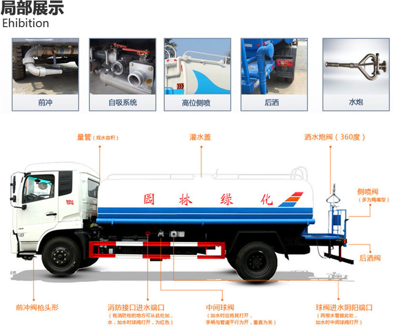 專用功能:配備前沖、后灑、側噴、后工作平臺帶綠化水炮,垂直吸程>6米,灑水寬度>14米,揚程>28米。引水時間