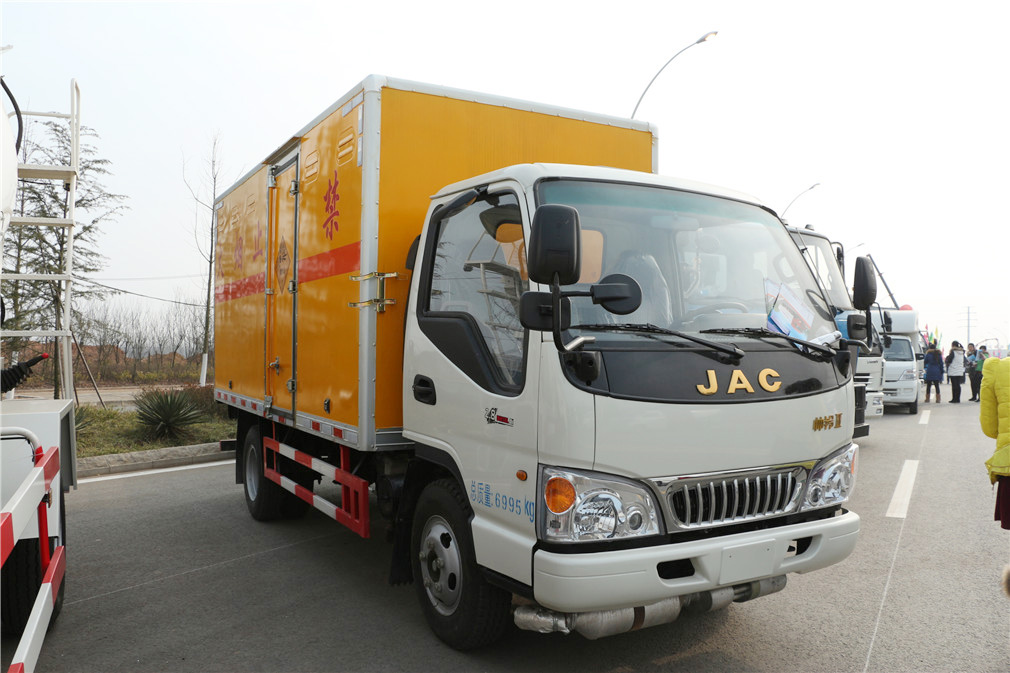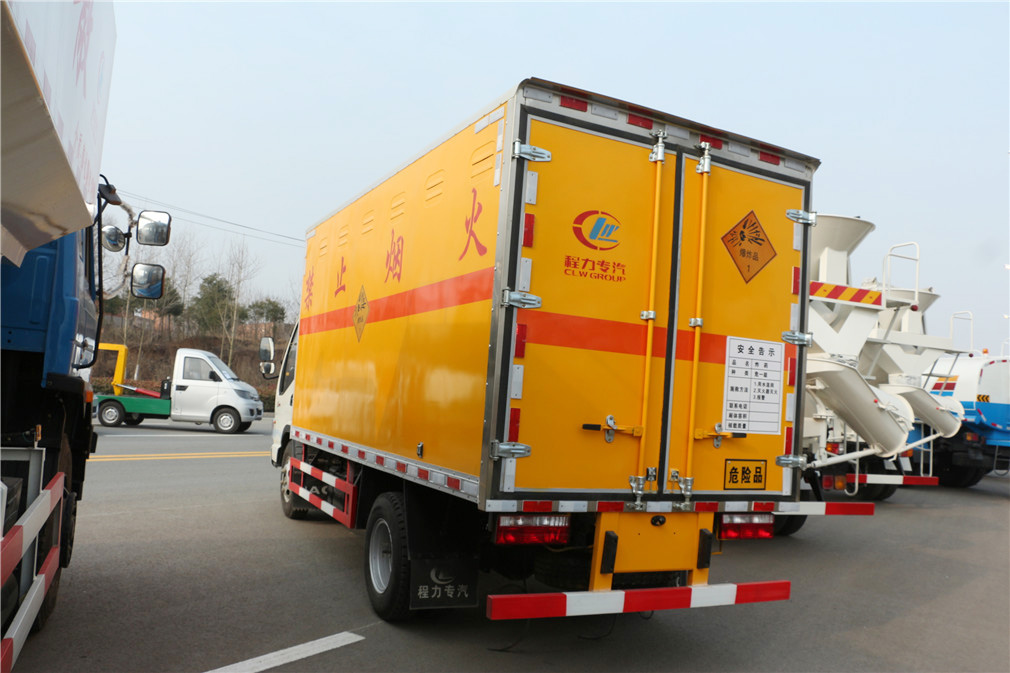 | 其他 | 隨底盤選裝駕駛室。危險貨物運輸車的車輛類型為:EX/Ⅲ,運送爆炸品的品名:黑火藥,壓縮黑火藥,電(非電)引爆雷管,爆破炸藥,導爆索,點燃導火索.煙花爆竹。 運送爆炸品的項號:1.1D,1.1D,1.1B,1.1D,1.4G.1.4G。車廂頂部封閉,不可開啟,選裝右側廂體前部開門,側防護為螺栓連接,后防護為焊接連接,后部防護裝置斷面尺寸(寬×高):50mm×100mm,離地高度為410mm.該車裝配具有衛星定位功能的汽車行駛記錄儀,該車裝配有限速裝置,ABS控制器型號及生產企業:CM4XL-4S/4M,廣州科密汽車電子控制技術股份有限公司,安裝前盤式制動器。 | ||