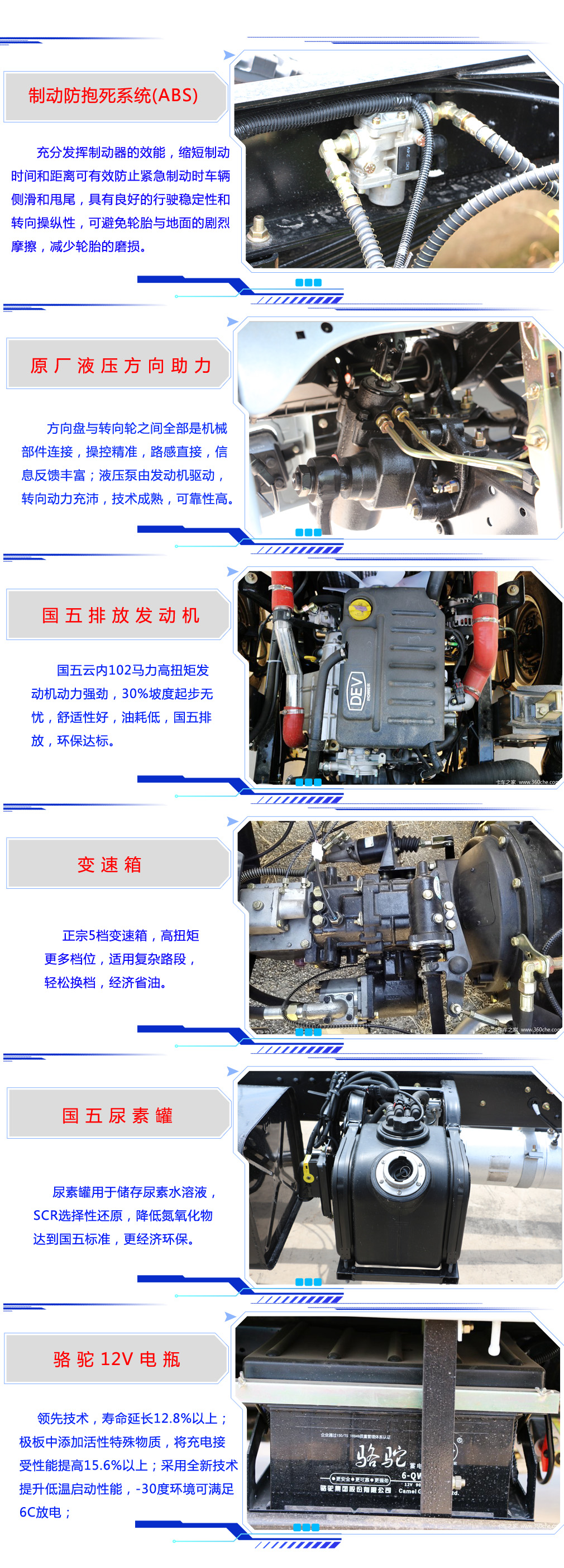 | 其他 | 1、随底盘选装驾驶室。2、防护材料:Q235A碳钢,连接方式:左右侧面及后下部防护均采用焊接连接,后部防护断面尺寸(mm):120×50,后部防护离地高度(mm):410。3、采用的发动机型号与油耗值对应关系为(L/100km): WP2.1Q82E50/12.86, D19TCIE1/12.76, SD4D25R-65/12.85。4、ABS型号:CM4XL-4S/4K(4S/4M),ABS生产厂:广州科密汽车电子控制技术股份有限公司。5、车辆颜色、文字喷涂及局部细节可变化。 | ||