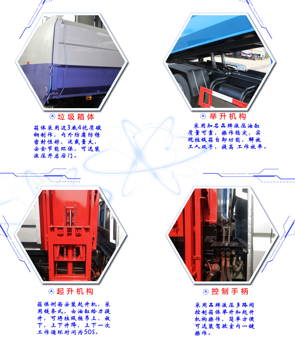 | 其他 | 自卸方式:后卸式。随底盘选装驾驶室。选装挂铁桶装置。防护材料:Q235A碳钢,连接方式:左右侧面及后下部防护均采用焊接连接,后下部防护断面尺寸(mm):100×50,后下部防护离地高度(mm):450。ABS型号为3631010-C2000,生产厂家为东科克诺尔商用车制动系统(十堰)有限公司。 | ||