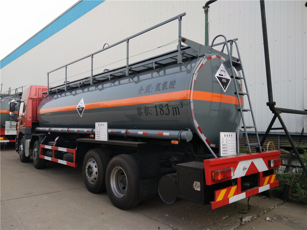 | 其他 | 该车适用于运输危险品。运输介质品名:次氯酸钠,液碱,氢氯酸,硫酸,氨水,密度分别为:1050千克/立方米,1040千克/立方米,1047千克/立方米,1045千克/立方米,990千克/立方米;类项号:8;罐体有效容积:18.1立方米; 罐体外形尺寸(长×径)(mm)为:8200×Φ1800。防护材料:Q235A碳钢,连接方式:左右侧面及后部防护均采用焊接连接,后部防护断面尺(mm):120×50, 后部防护离地高度(mm):520。仅采用底盘子午线轮胎和带ABS的底盘,该车前轮安装盘式制动器,前置排气管 | ||