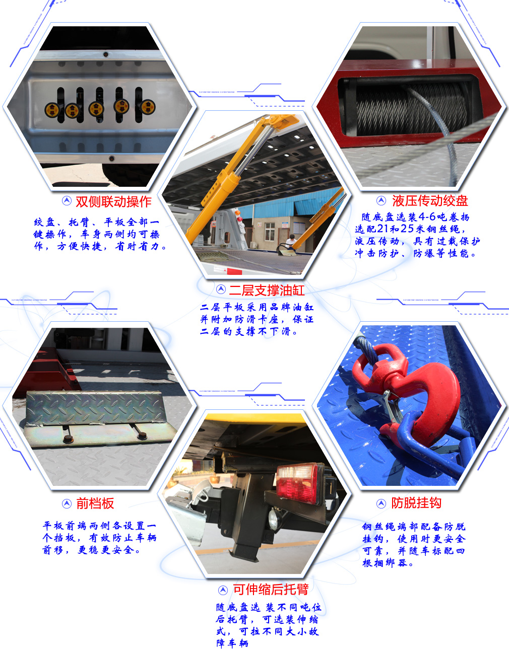 | 其他 | 1,该车用于道路清障。当整备质量为8950(kg)时托举质量6650(kg),当整备质量为7630(kg)时托举质量7970(kg)。2.上板选装单层结构。3,防护材料:Q235A碳钢,连接方式:左右侧面防护装置与大梁螺栓连接;车身本体及专用装置代替后防护装置,故豁免.4.整车长/轴距/后悬对应关系为(mm):9500/5600/2670,9500/5200/3070,8500/4700/2570,8500/4500/2770.轴距的变化导致整备质量的变化在百分之三的范围内。5.ABS系统生产厂家,型号 | ||