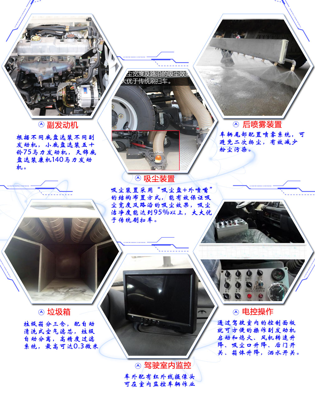 | 其他 | 1,防护材料:Q235A碳钢,连接方式:左右侧面防护装置与专用装置(吸盘)相干涉故可豁免;后下部防护装置与大梁螺栓连接,后部防护断面尺寸(mm):100×50,后部防护离地高度(mm):380。2,ABS厂家及型号:襄阳东风隆诚机械有限责任公司/ABS/ASR-24V-4S/4M。3,随底盘选装驾驶室。4,文字喷涂颜色位置可变化。 | ||