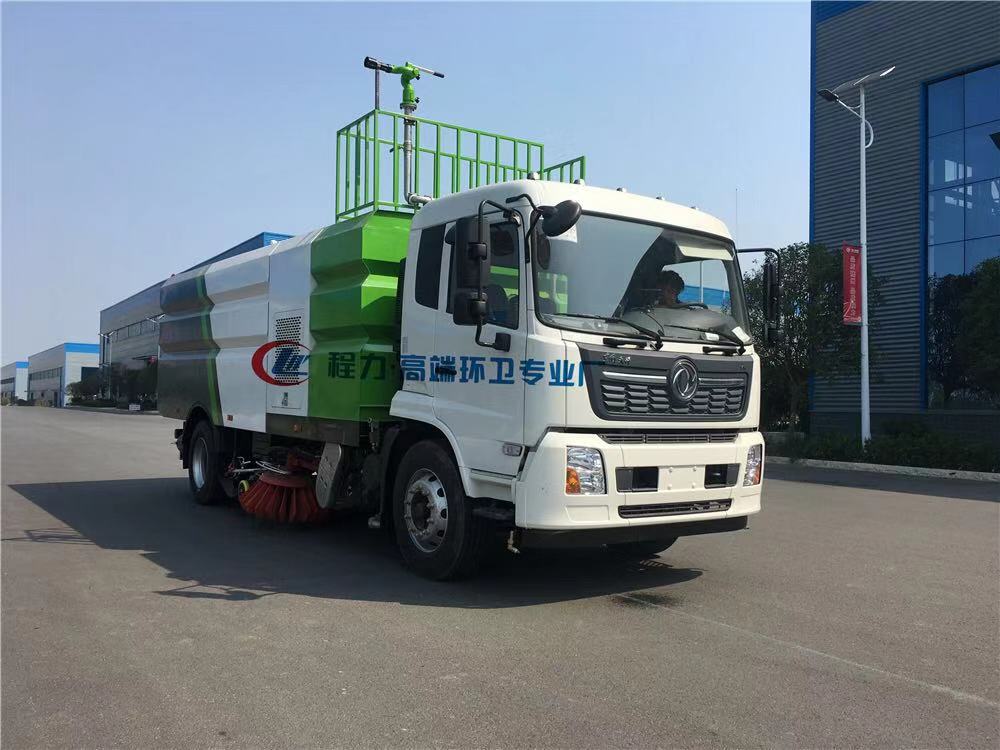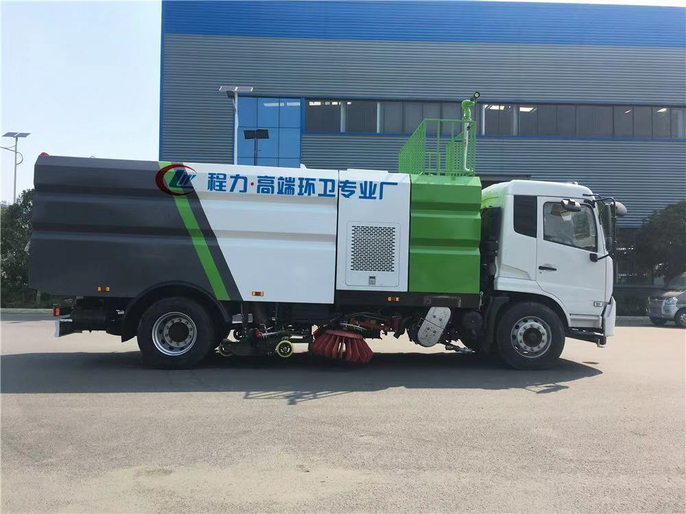 該洗掃車采用東風(fēng)天錦二類底盤改裝,加裝副發(fā)動機(jī)、風(fēng)機(jī)、清水箱、垃圾箱、左右立掃、掃盤降塵系統(tǒng)、左右高壓側(cè)噴高、吸盤內(nèi)置高壓主噴桿、氣動系統(tǒng)、液壓系統(tǒng)、專用裝置電控系統(tǒng)和副車架等改裝而成。