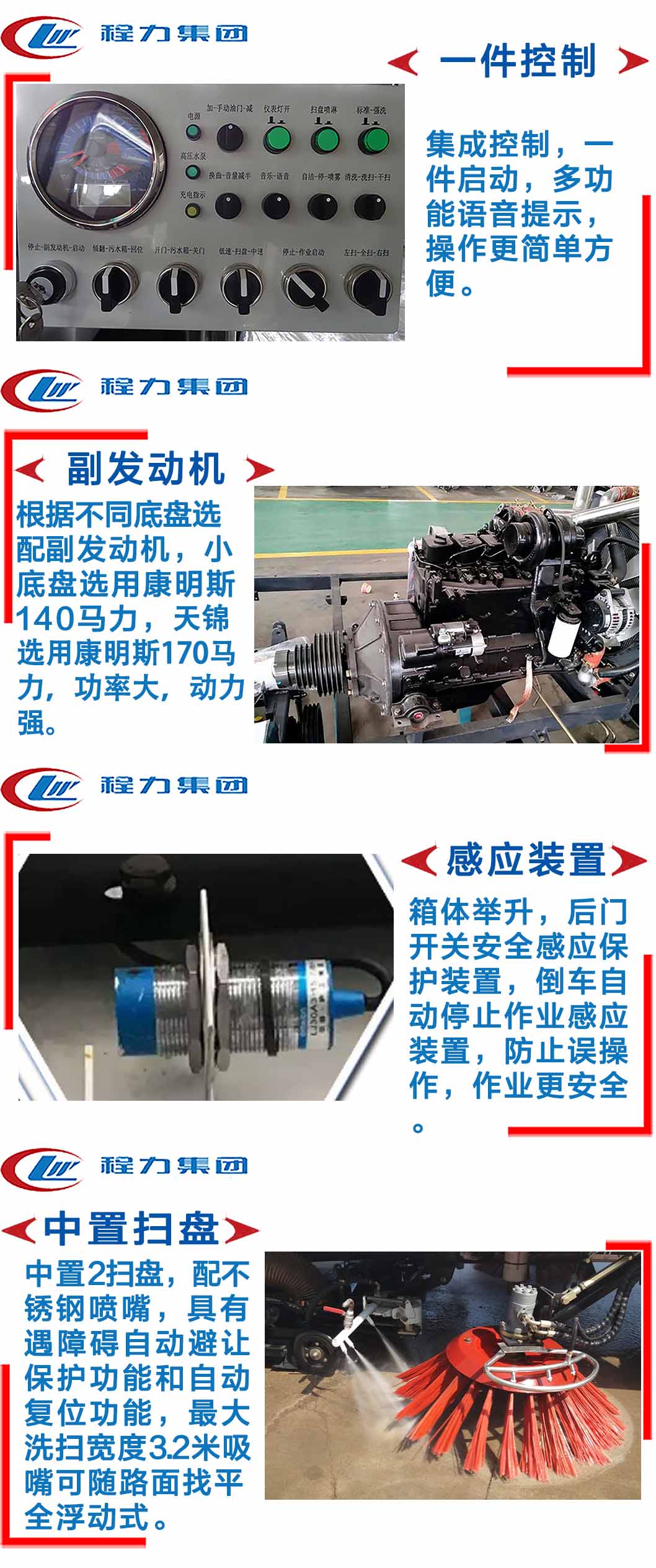 | 其他 | 隨底盤選裝駕駛室,選裝吸盤中置和雙掃刷及無掃刷結構,選裝后部結構;選裝弧形垃圾箱。側防護由專用裝置代替。后防護采用冷彎鋼/Q235-A,焊接連接。后防護截面高度尺寸240mm, 截面寬度尺寸60mm,下邊緣離地高度400mm。ABS型號/企業: ABS-E 4S/4M/威伯科汽車控制系統有限公司。 | ||