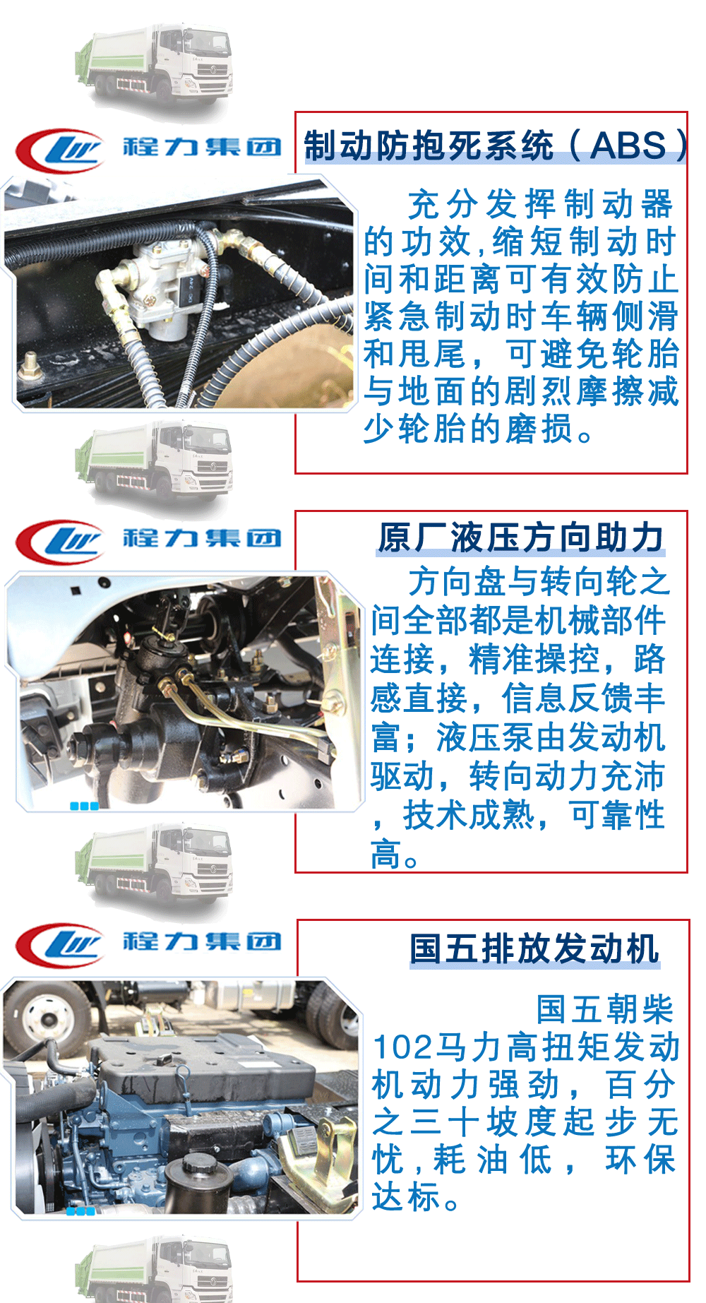 | 其他 | 備注:隨底盤選裝駕駛室;僅選用3800mm軸距;選裝后部裝料機構;整車長/前懸/后懸/后伸(mm)對應關系為:7400/1130/2170/300,7400/1150/2150/300,7300/1130/2170/200,7300/1150/2150/200;側防護材料Q235,螺栓連接;后防護由專用裝置代替,車輛后端離地高度400mm;ABS型號:ABS/ASR-24V-4S/4M,廠家:襄陽東風隆誠機械有限責任公司;發動機/油耗值L/100km對應關系分別:CY4SK251/18.7,YC4FA130-50/18.7,ISF3.8s5141/18.6,ZD30D15-5N/18.5,4DX23-140E5/17.8,YN38CRE1/17.9;專用裝置為垃圾箱與壓縮機構,主要用于城鎮環衛垃圾的壓縮與運輸. | ||